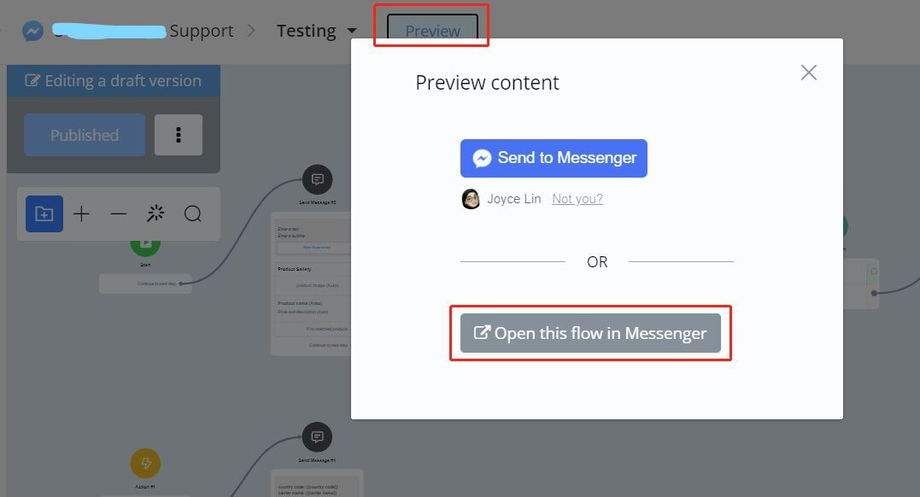 Preview Feature - Please note that "Preview" feature is not supported in all channels. Channels support "Preview": Facebook, Telegram, WhatsApp, Line and Viber. For channels without Preview, search "talk to bot" in the documentation for guidance.