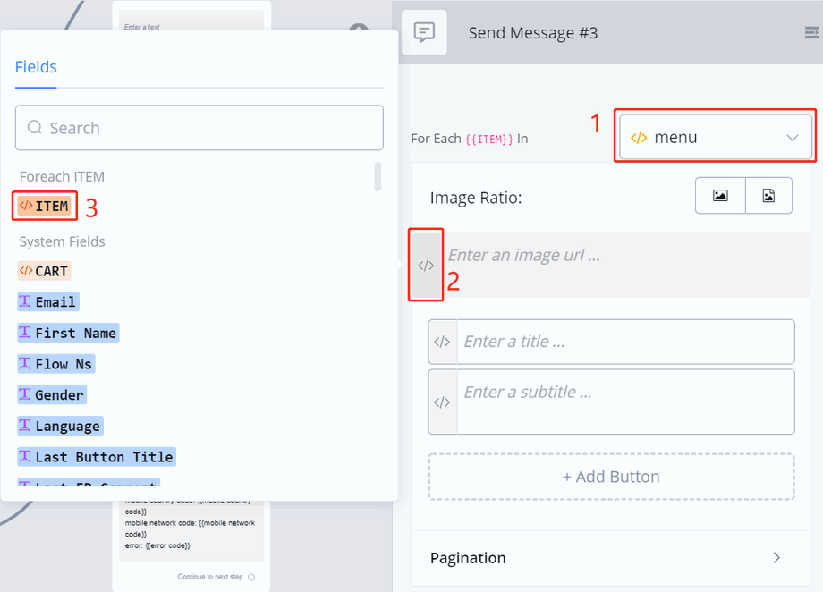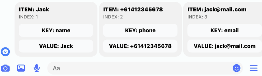 This message type is also showing cards but in a more automatic way. With "For Each", you don't need to type in each card yourself. It automatically displays all items in a JSON variable.