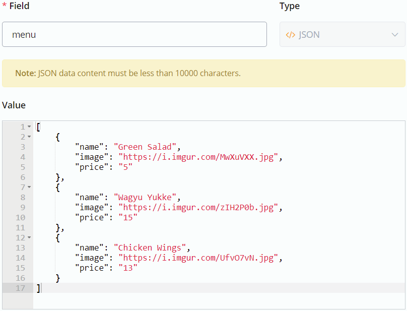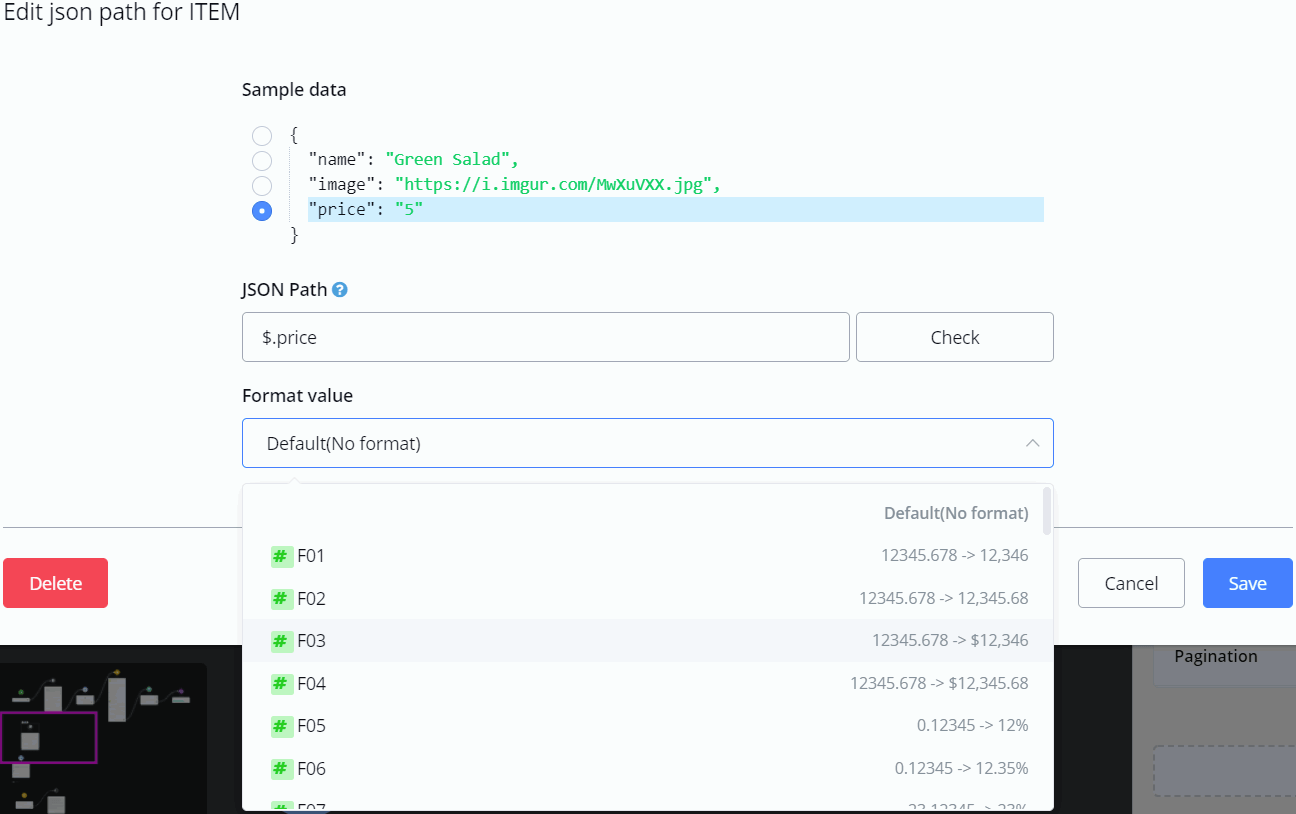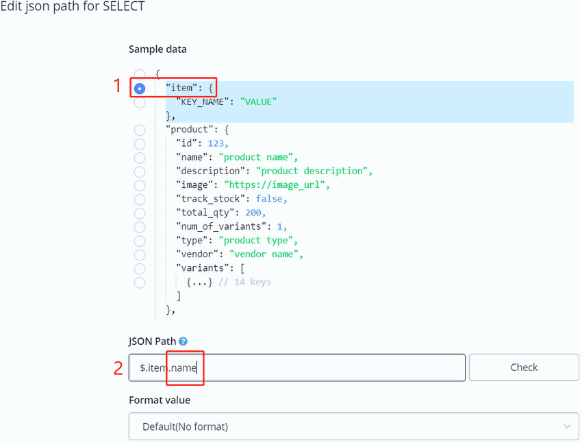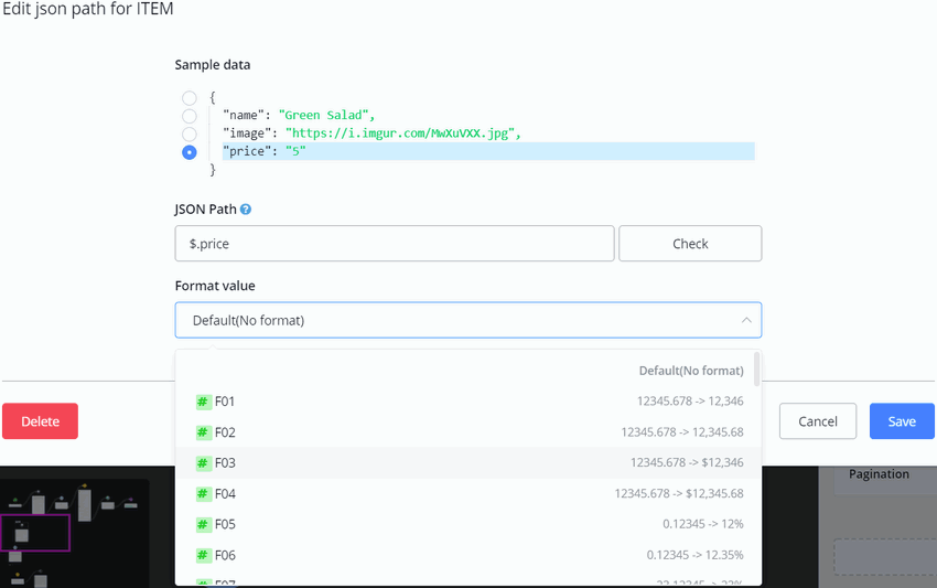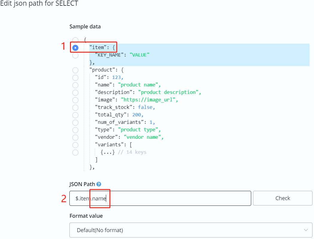The "Sample data" is to quickly fill in the "JSON Path" field. For example, as shown in the picture, click the "price" row, and "$.price" appears in the "JSON Path" itself. This means that, we are displaying the price of each item here. If there is no sample data prompted, you can fill in the path yourself by typing "$.", which refers to each item in the JSON variable, followed by the key of a value.