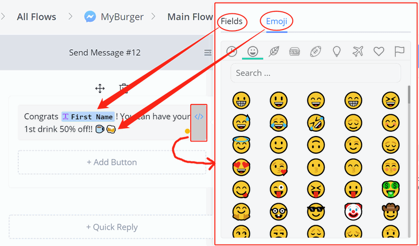 Wherever you see "</>", you can insert emojis or variable values to the text.