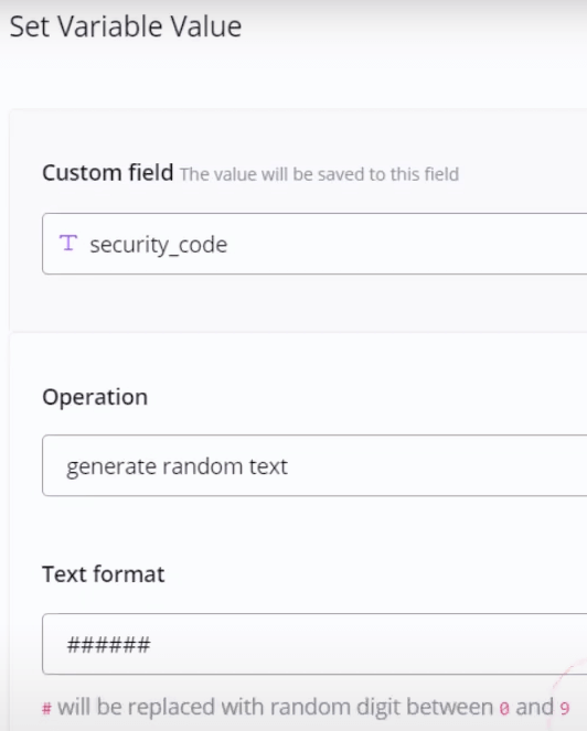 You can use the "generate random text" operation with text variable to get a random security code and send out for verification purpose shown in the pictures.