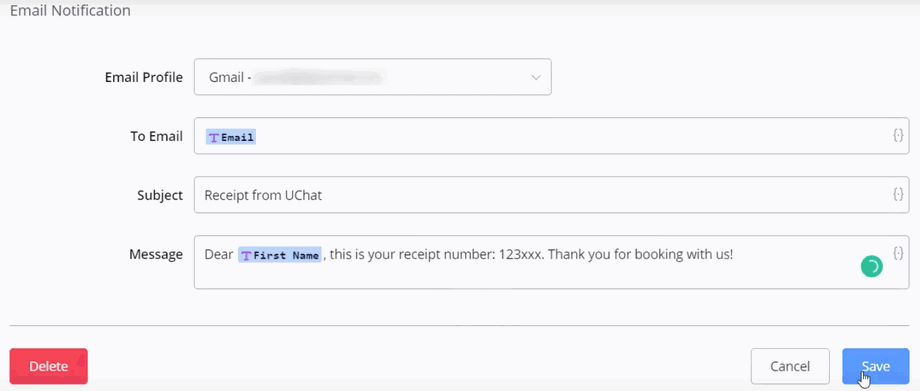 Unlike "Send Email" step, email notification only supports text message type. Check "Send Email" step in "Email Integration" page if you need more message types like images, buttons, files, etc.