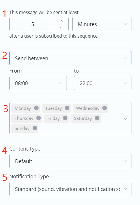 Similarly, if you don't want to bother users at weekend, deselect Saturday and Sunday. See the example in the "send between" above.