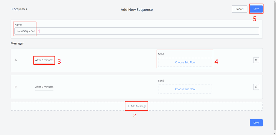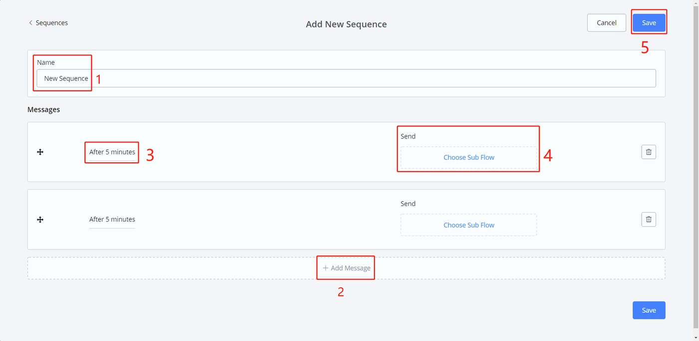 Use sequences to automatically send follow up / delay messages to customers. You can send multiple messages with different delays.