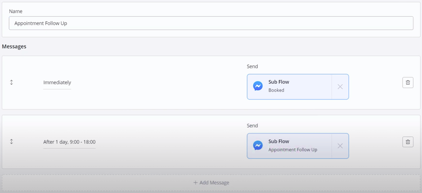 In the above screenshot, for example, the "Booked" sub flow will be sent "Immediately" once the user subscribes to this "Appointment Follow Up" sequence. Because the first message begins the count down once the user subscribes.