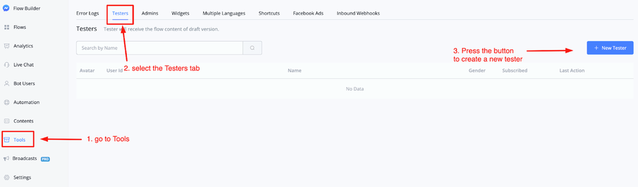 To invite a tester to your chatbot just go to Tools from your left-hand menu, then select the Testers tab.