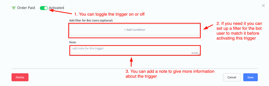 You will be able to enable or disable the trigger, set up a condition if you need the bot user to match a certain filter before the trigger is activated, and you can add a note that will explain more about this trigger.