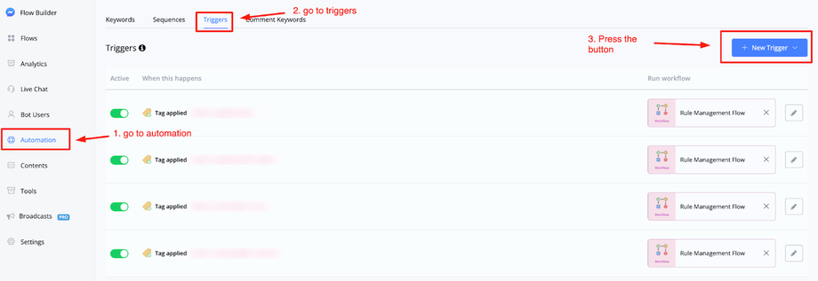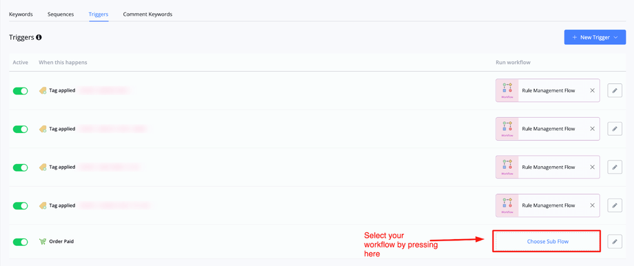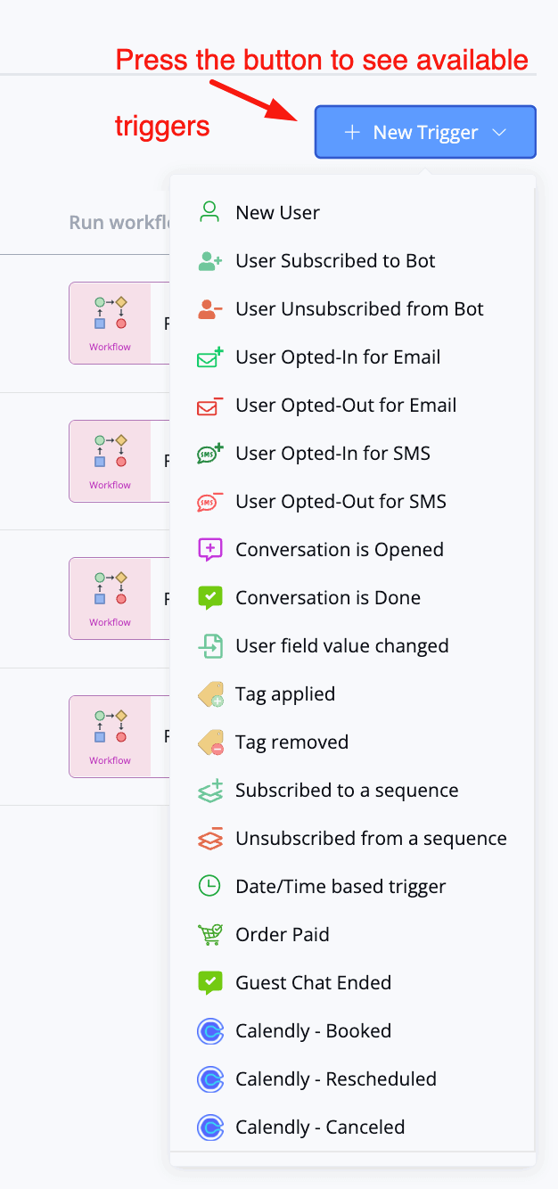 Let’s take an example of a trigger when someone pays for order inside your chatbot. Press the blue button + New trigger then select the trigger named as such: Order Paid