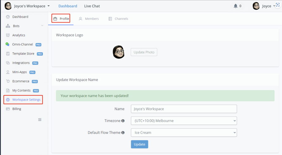 Manage workspace profile