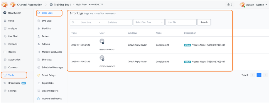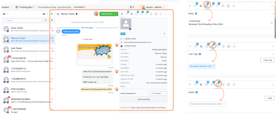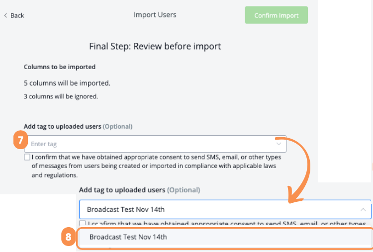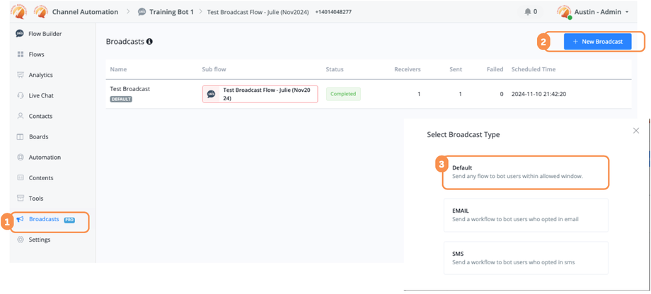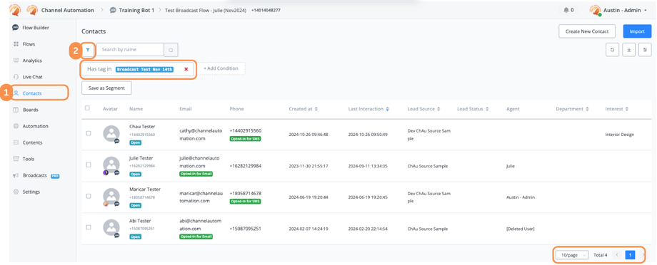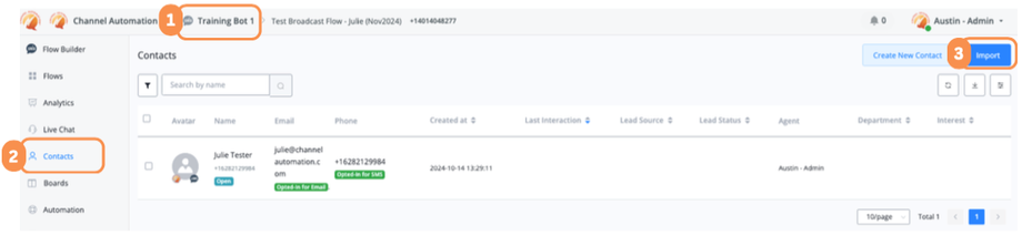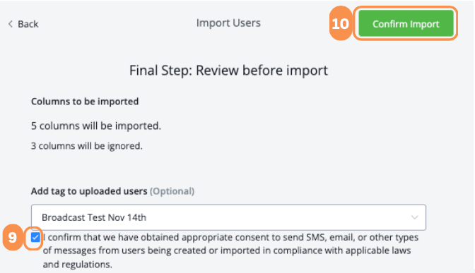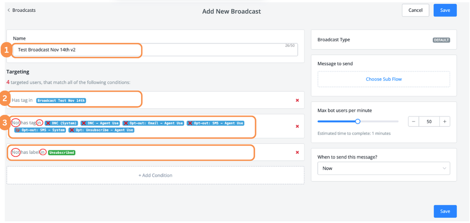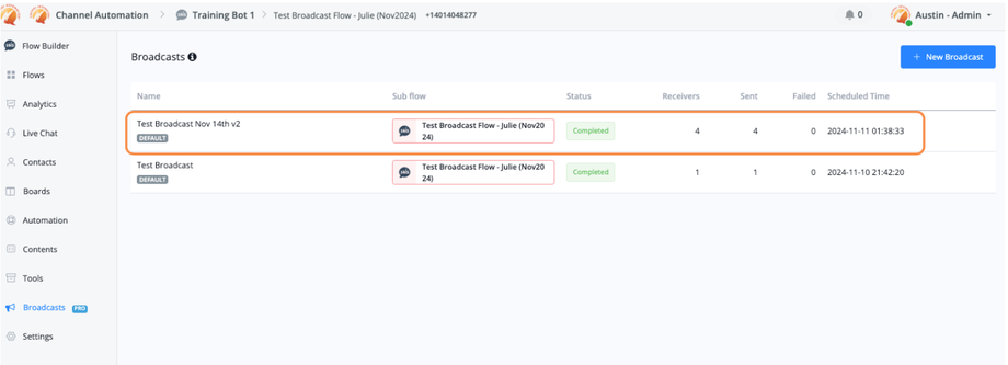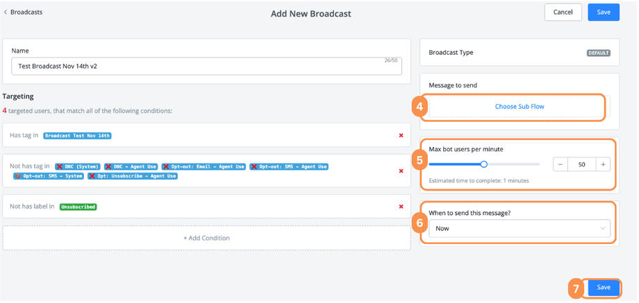 Note: If you are importing new leads into the system, make sure to include an opt-in node in your broadcast flow so they can begin receiving messages.