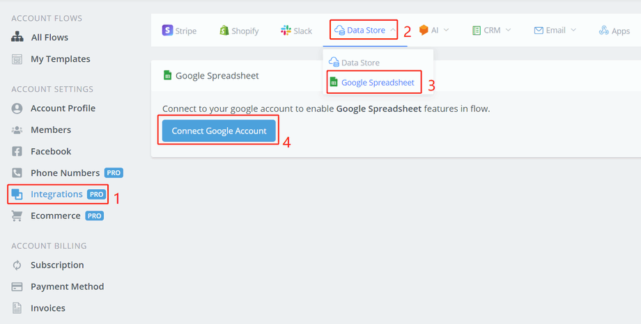 Follow steps 1 to 4 to connect to your Google account. Allow Channel Automation to access your Google spreadsheet. When you come back, if nothing changed, click step 1 to 3 again to refresh and you will see this: