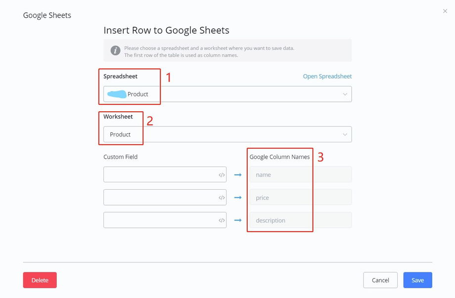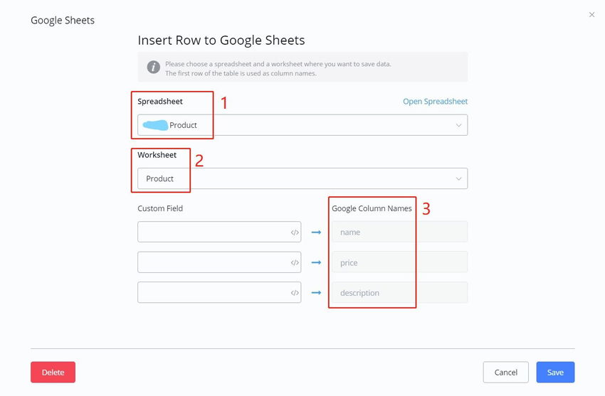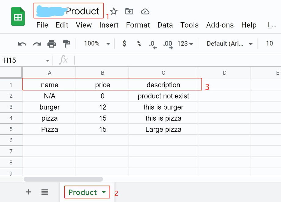 WARNING - Importantly, remember to give column names for the worksheet in the first row (see area 3 in the above picture). You must do this by manually type in what fields do you need. For example, this is a product worksheet and each product has a name, a price and a description.