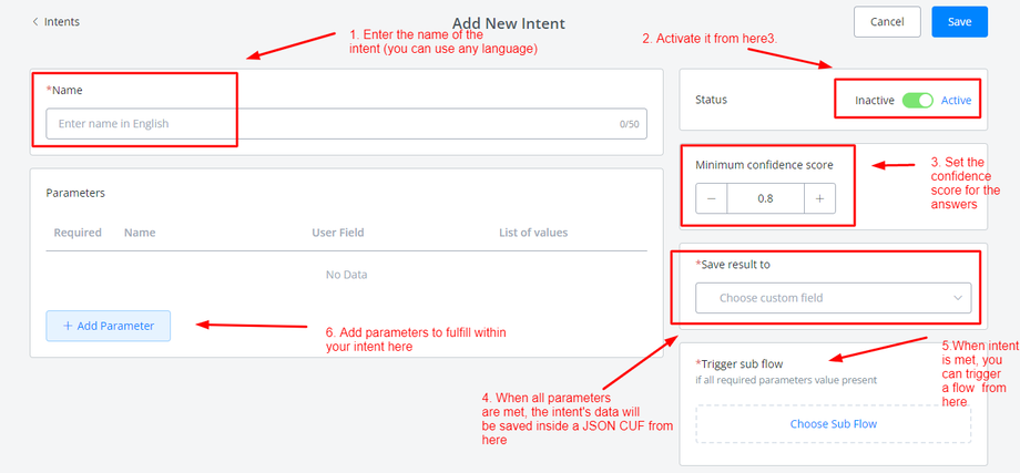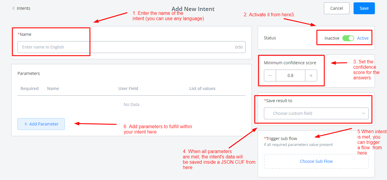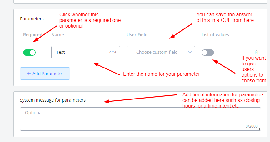 Once an intent is successfully matched, it will trigger the parameter values collection until all the parameters are filled before triggering the final attached flow.