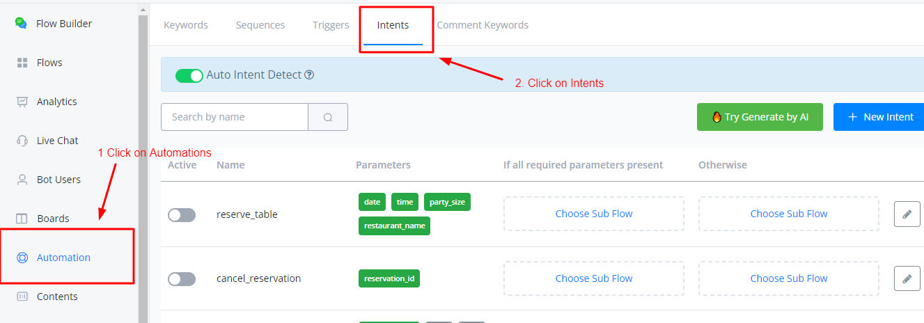 Channel Automation with its native integration with Open AI has now released an intent detection system, which enables the users to collect parameters based on the intent of the query provided. The system works like Google’s Dialogflow where you make intents and fill out entities.