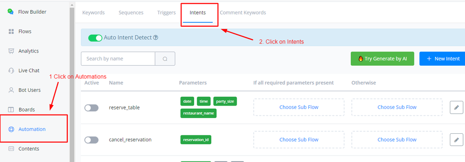 You can use intents by going inside the Automations tab from inside your bot.