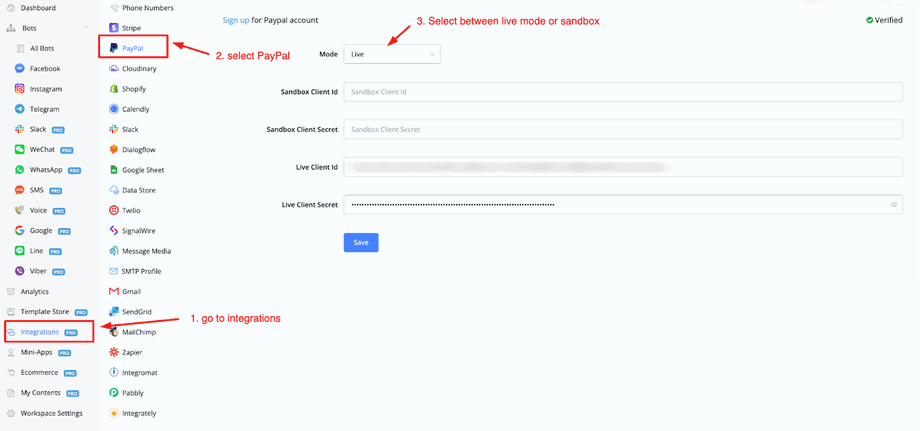 You can now integrate your PayPal account into your workspace. To find your PayPal integration go from your main dashboard and select Integrations from the left-hand menu. Then select PayPal from the list