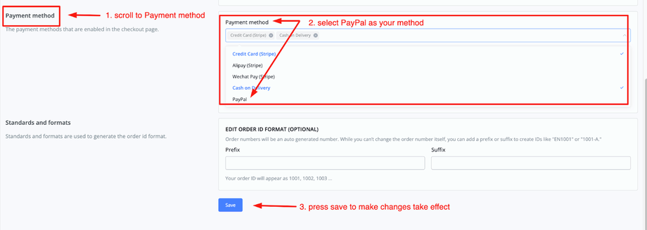 Scroll all the way down until you see the section called Payment Method. From here select PayPal as one of the methods for your ecommerce store. Don’t forget to press save to let the changes take effect.