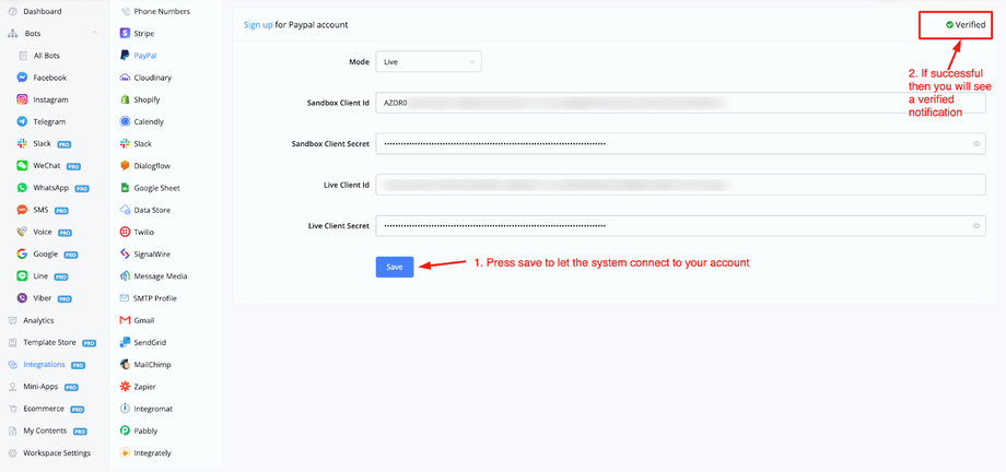 Once you copied and pasted all the details in your workspace integration section press save and you should see a verified notification popping up in the top right corner.