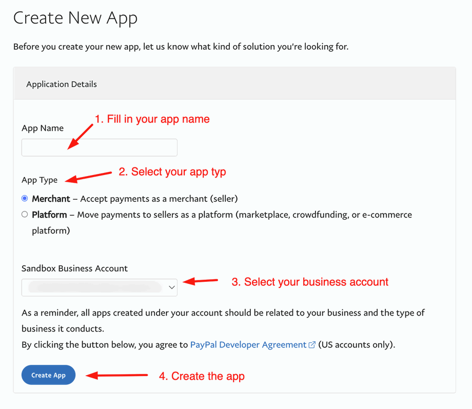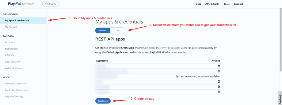 To fetch your credentials login to your PayPal account and then head to your developer dashboard.