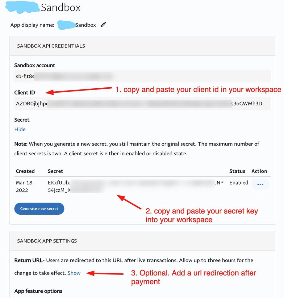 After you created the app you will be taken to the page where you can fetch the client id, the client secret key and paste those into your workspace integration settings for PayPal.
