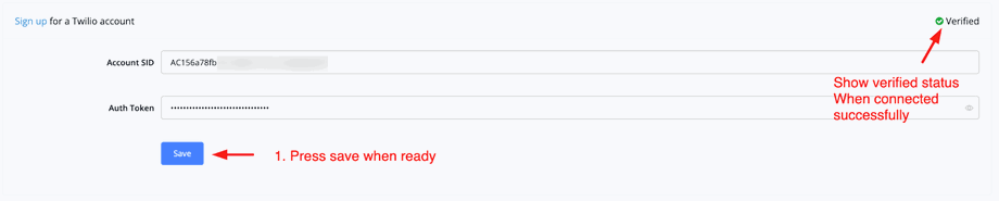 Copy and paste both into your workspace Twilio section and press the save button. If all goes well then you should also see a verified status in the top right corner of your screen