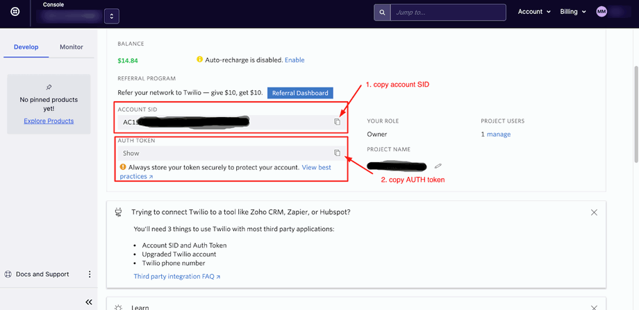 Login to your Twilio account (opens new window)and when arriving at your dashboard overview you will be able to directly grab the Account SID as well as the AUTH token