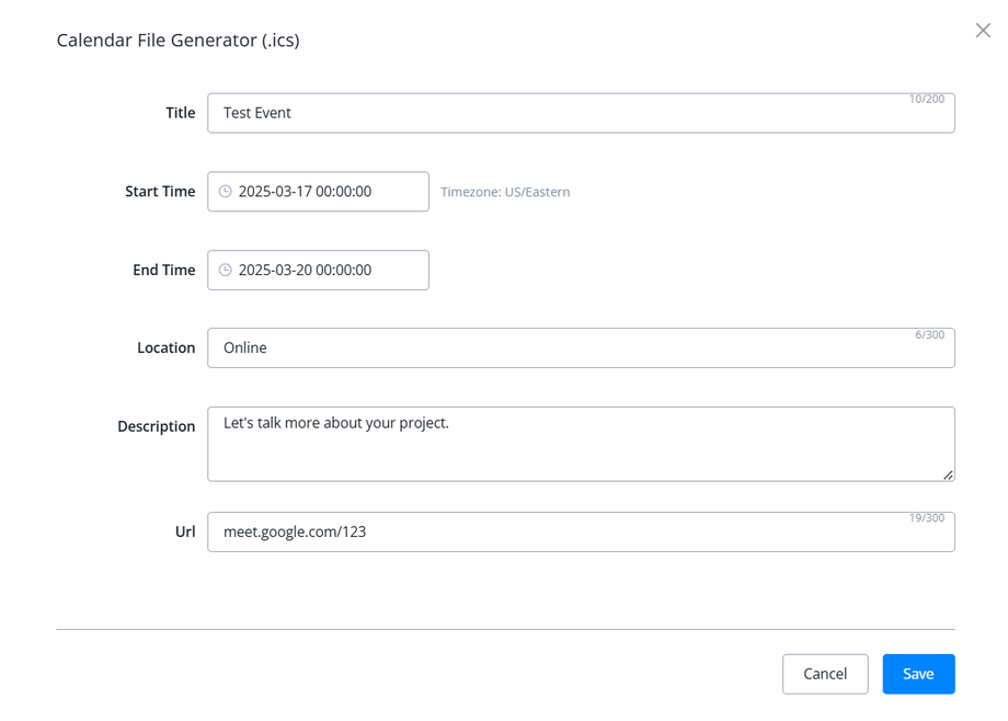 4. Fill in the rest of the relevant details, and click Save. The calendar file has been generated and is ready to send.