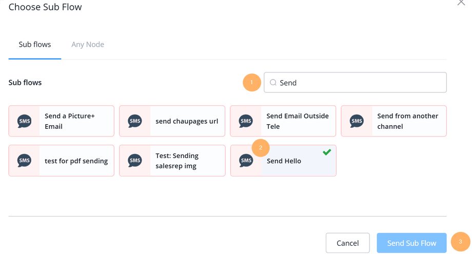 1. Click the icon to bring up the Sub Flow popup. Search for your desired automation using the search bar and select it..
